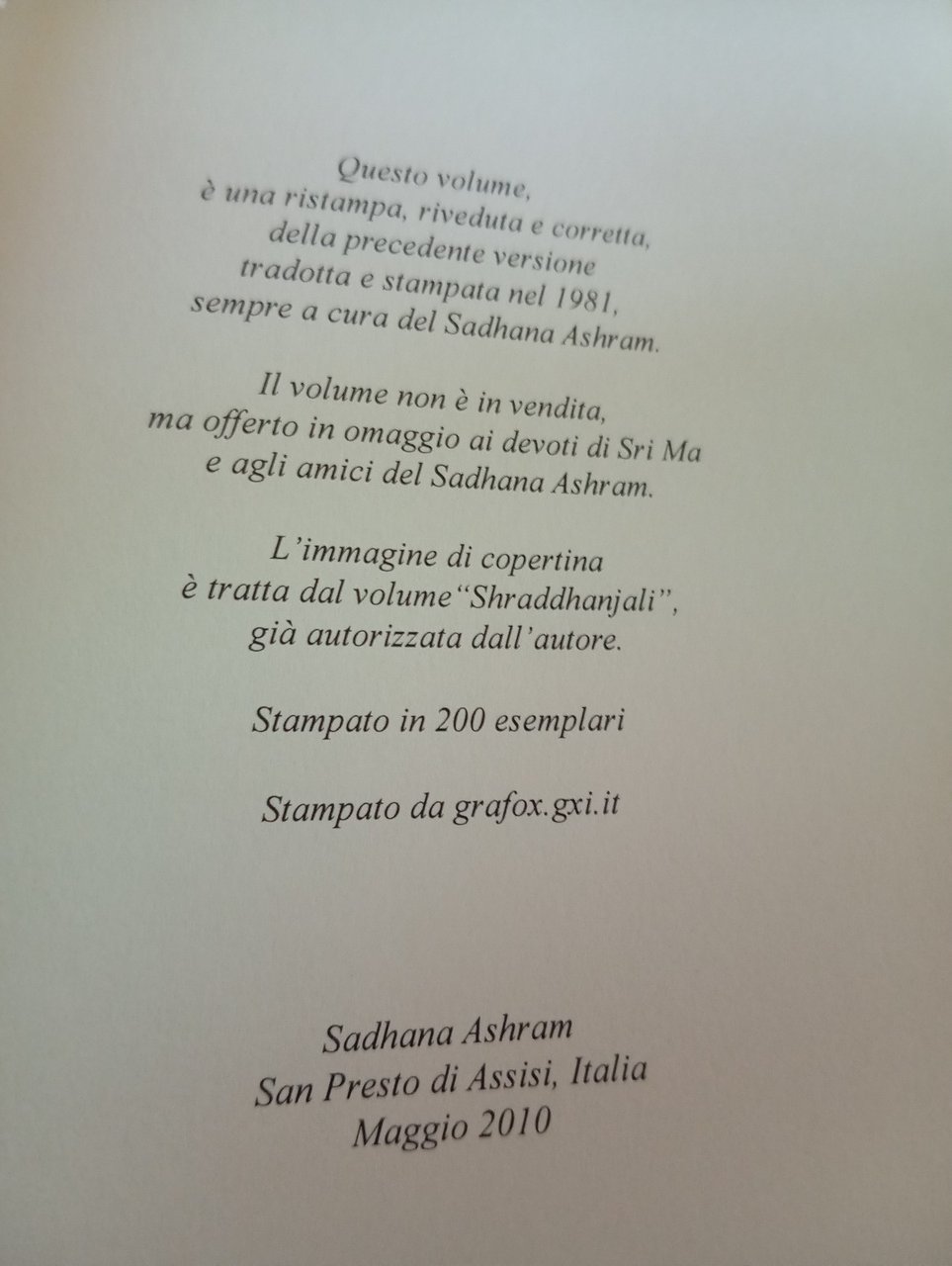 Matri Vani, Così disse Sri Ma, 2010, tiratura limitata