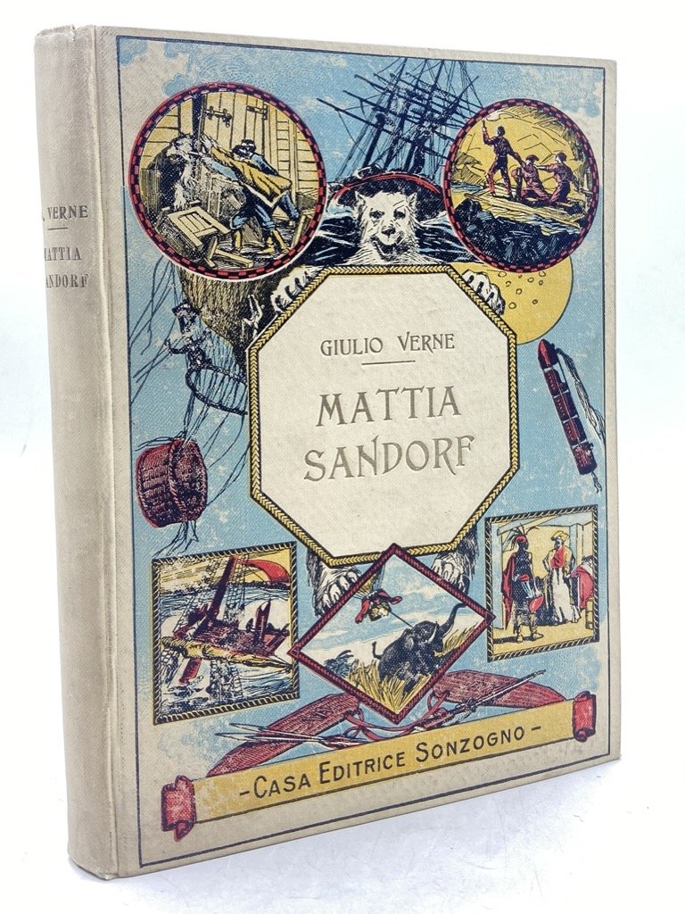 Tela editoriale illustrata, cm 21.5 x 15.5, pp 442 (2) illustrate da numerose figure xilografiche in nero. Ben conservato. Bel volume nella legatura strenna di Sonzogno, illustrata con i classici temi di Jules Verne (viaggi, paesi esotici, animali selvaggi, macchine volanti, naufragi) e con sguardie decorate col monogramma dell'editore, che raccoglie le 28 dispense illustrate della versione italiana di Mathias Sandorf, romanzo apparso all'origine nel 1885 per Hetzel. All'occhietto «Viaggi straordinari» e indicazione «Unica traduzione autorizzata dall’Autore», all’antiporta riportate la lettera con cui Verne dedicò il romanzo ad Alexandre Dumas e la risposta di quest'ultimo. Non comune in questo stato di conservazione.