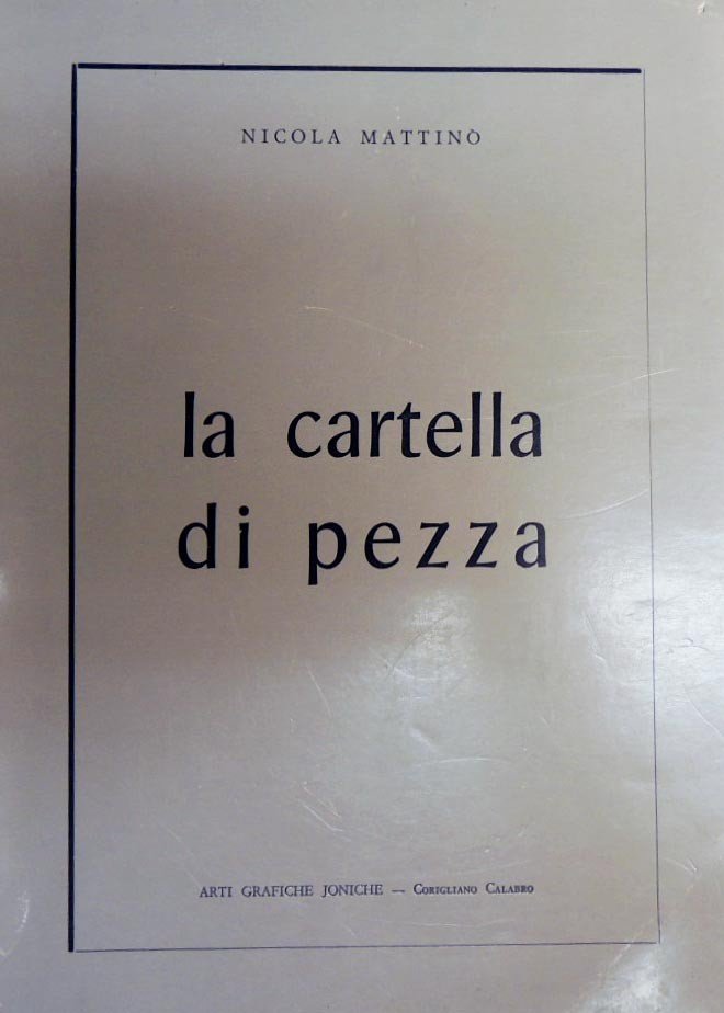 Nicola Mattino, La cartella di pezza, Arti Grafiche Joniche, Corigliano Calabro 1971, pp. 112, cm 22, br. ed. Volume di poesie e ricordi sul paese di Lungro, in provincia di Cosenza. Dedica manoscritta dell’autore al frontespizio. Etichetta con segnatura di collocazione di estinta biblioteca al dorso, al frontespizio, timbro e numero di inventario di estinta biblioteca. Lievi tracce d’uso alla brossura, minima ingiallitura delle pagine, qualche fioritura ai tagli, ma nel complesso esemplare in buono stato di conservazione. Rarissimo.
