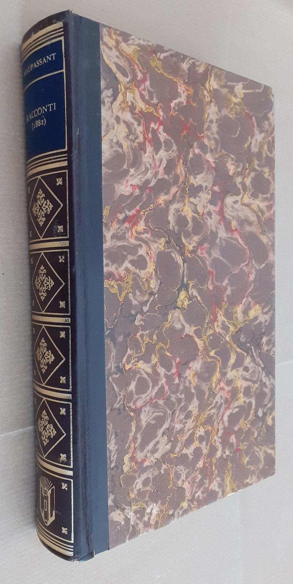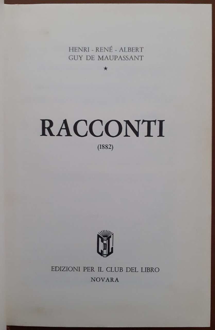 Henri René Albert Guy de Maupassant, Racconti (1882), Edizioni per il Club del Libro, Novara 1969, pp. 440, cm 22, legatura in mezza similpelle ed. con titoli e fregi al dorso e piatti in carta marmorizzata. Collana dei grandi narratori, vol. 48. Esemplare n. 1454. Titolo originale: Contes et nouvelles. Traduzione di Rosanna Pelà. Prefazione di Carlo Bo. Indice: Maupassant testimone e vittima – Un colpo di Stato – Un cenone – Petizione di un gaudente suo malgrado – La torta – Il ceppo – Parole d’amore – Ricordo – Marroca – Il salto del pastore – Il letto – Vecchie cose – Il cieco – Magnetismo – Un figlio – In viaggio (I) – In viaggio (II) – Una sorpresa – Un bandito corso – Incontro – La veglia – Altri tempi – Storia vera – Il ladro – Confessioni d’una donna – Chiaro di luna (I) – Un gallo cantò – Sogni – Il chiavistello – Un dramma vero – Burla normanna – Lo zio Sosthène – Viaggio di nozze – Una passione – Pazzo? – Corrispondenza – Una vedova – La ruggine – L’impagliatrice – Uno strattagemma – Un vecchio – Chiaro di luna (II) – Pierrot – Un normanno – Il perdono – La reliquia – La paura – In campagna – Un milione – Il testamento – Il bacio – Il lupo – Minuetto – Quel porco di Morin – Madame Baptiste – Mia moglie – La beccaccia – La pazza – Scaltrezza – La leggenda del Monte San Michele – Yveline Samoris – Racconto di Natale – Notte di Natale. Lievi tracce d’uso, minime fioriture ai tagli, tenue brunitura della carta, per il resto ottimo esemplare.
