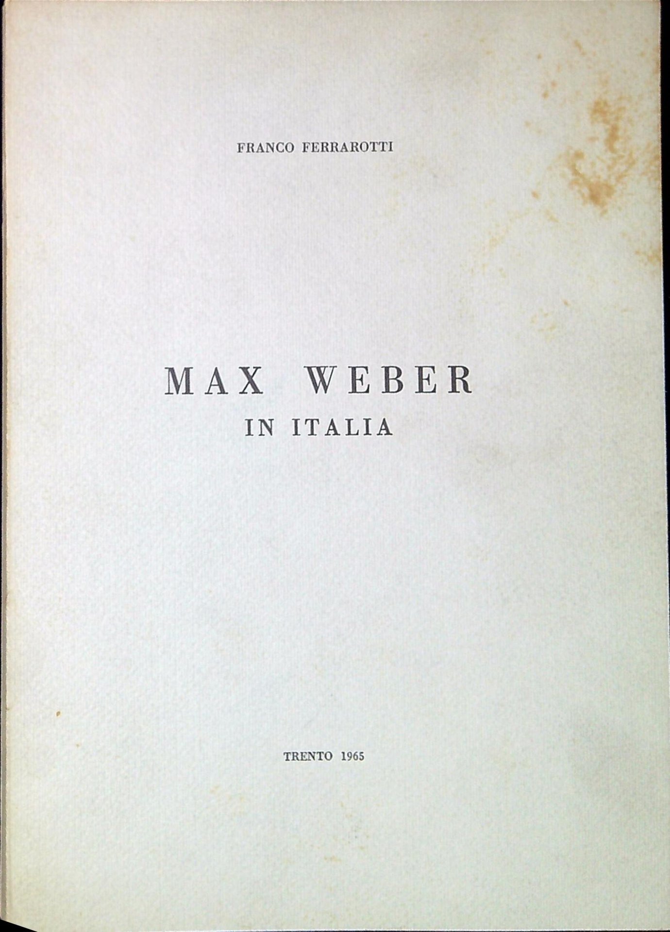 Ferrarotti, Franco Max Weber in Italia : con 2 appendici. Trento, Saturnia 1965, 24 182 p. 182 p. ; 24 cm Macchia al piatto superiore In appendice: L'etica economica delle religioni del mondo : da: Gesammelte Aufsatze zur Religionssoziologie / bibliografia di M. Weber . (55264)