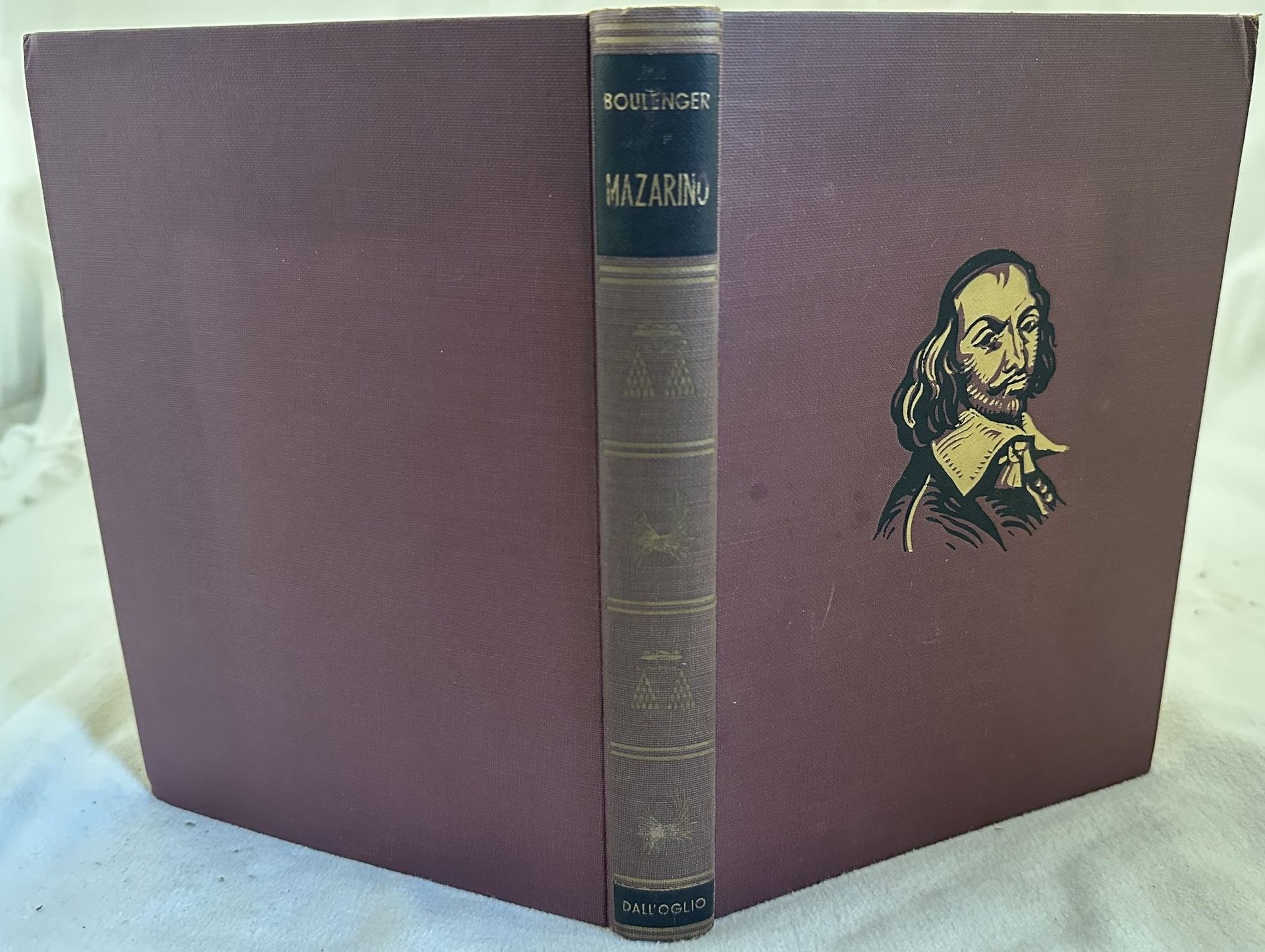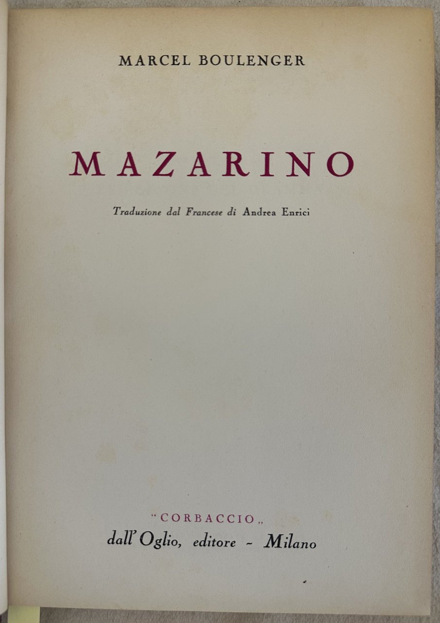 Edizione del 1954 di queste opera su Giulio Raimondo Mazzarino (1602-1661) di Marcel Boulenger. Traduzione dal francese di Andrea Enrici. Numerose tavole fotografiche fuori testo. L'opera è in un volume ed è completa. Volume offerto come dono dal Comitato di Tripoli nel 1957, etichetta alla prima carta bianca. In ottime condizioni. Copertina in tela editoriale in ottime condizioni generali con lievi usure ai margini e dorso. Legatura in buone condizioni. Pagine in buone condizioni con rare fioriture. In 8. Dim. 22x16,5 cm. Pp. 267+(5). Edition of 1954 of this work about Giulio Raimondo Mazzarino (1602-1661) by Marcel Boulenger. Translation from french language by Andrea Enrici. Different out of text photographic plates. The work is in one volume and it is complete. Volume offered as a gift by the Comitato di Tripoli in 1957, label in the first blank page. In very good conditions. Cloth editorial cover in very good general conditions lightly worn in theextremities. Binding in good conditions. Inside pages are in good conditions with occasional foxing. In 8. Dim. 22x16,5 cm. Pp. 267+(5).