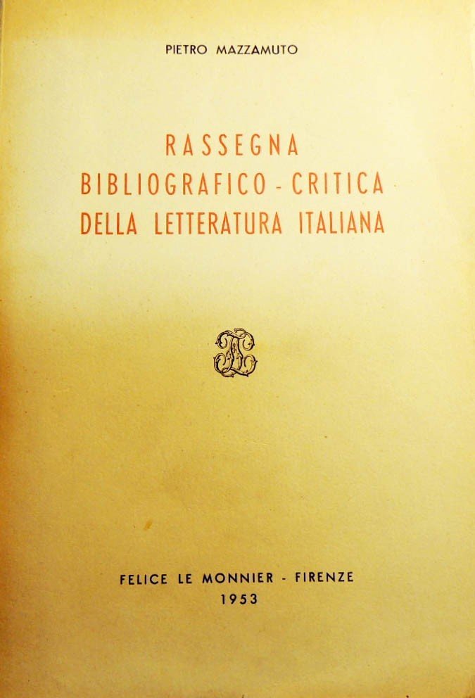 Pietro Mazzamuto, Rassegna bibliografico-critica della letteratura italiana, Felice Le Monnier, Firenze 1953, pp. 650, cm 23, br. ed. Rare sottolineature a pastello, ultima pagina incollata alla copertina, dorso lievemente allentato, per il resto esemplare ancora buono, in parte intonso.
