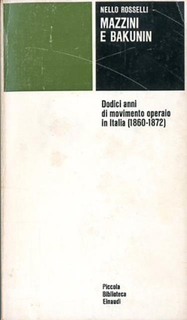 5. ed, rist. 368 p. ; 18 x 11 cm. Piccola Biblioteca Einaudi. Geografia. Storia, 89. Il volume «Mazzini e Bakunin» scritto da Nello Rosselli è una ricerca uscita nella sua prima edizione nel 1927 e ancora oggi a distanza di quasi un secolo è sempre un utile lettura per chi vuole approfondire le radici storiche del movimento operaio italiano nelle sue componenti repubblicane e libertarie. Si tratta di un testo storico-politico che ripercorre l’origine e la genesi della formazione politico/ideologica della democrazia italiana nel primo decennio post-unitario con l'emergere della «questione sociale» come elemento dirompente nella società italiana dell'epoca. La storia del movimento operaio delle origini, a partire dalle Società Operaie e di Mutuo Soccorso, si interseca e si fonde con le lotte Risorgimentali per la libertà e l’emancipazione dall’Impero Asburgico, dalla Chiesa e dalla Monarchia Sabauda e nel contempo si afferma una vena ribelle e libertaria, prettamente antiautoritaria, distinguendosi per originalità dalle altre storie del movimento operaio europeo. Prefazione di Leo Valiani. Brossura editoriale, coperte in cartoncino flessibile, illustrata a colori (b/n e rosso/arancione), titolo impresso al piatto e al dorso. Codice libreria 8563.