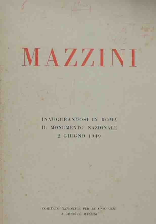 Mazzini. Inaugurandosi in Roma il monumento nazionale 2 giugno 1949, Comitato per le Onoranze a Giuseppe Mazzini, Roma s.d. (1949?), pp. 84, ill. b.n. 2 c. di tav. f.t. ill. b.n. di cui una ripiegata, cm 31, br. ed. Leggere tracce d’uso, qualche cifra annotata a pastello alla prima di copertina, minime fioriture, carta lievemente brunita, per il resto buona copia.