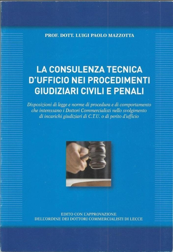 Luigi Paolo Mazzotta, La consulenza tecnica d’ufficio nei procedimenti giudiziari civili e penali. Disposizioni di legge e norme di procedura e di comportamento che interessano i Dottori Commercialisti nello svolgimento di incarichi giudiziari di C.T.U. o di perito d’ufficio, s.n., s.l. (ma stampato a Galatina, Lecce, presso l’Editrice Salentina) 2010, pp. 126, cm 24, br. ed. In calce al frontespizio: Edito con l’approvazione dell’Ordine dei Dottori Commercialisti di Lecce. Perfetto.