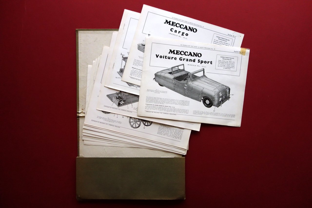 Liverpool, s. d. ma anni '20 - '30 del Novecento circa; 13 fogli di istruzioni per costruzioni Meccano, tutti di pp. circa 8, ill. in b/n; custodia ed. in cartonato telato con titolo impresso in oro al dorso, al lato interno timbretto di antico rivenditore. Esemplare non completo: i fogli presenti sono i numeri 1, 2, 4, 5, 8, 9, 11, 13, 14, 15, 16, 17, 19. Dimensioni: cm 21,5x28,5.