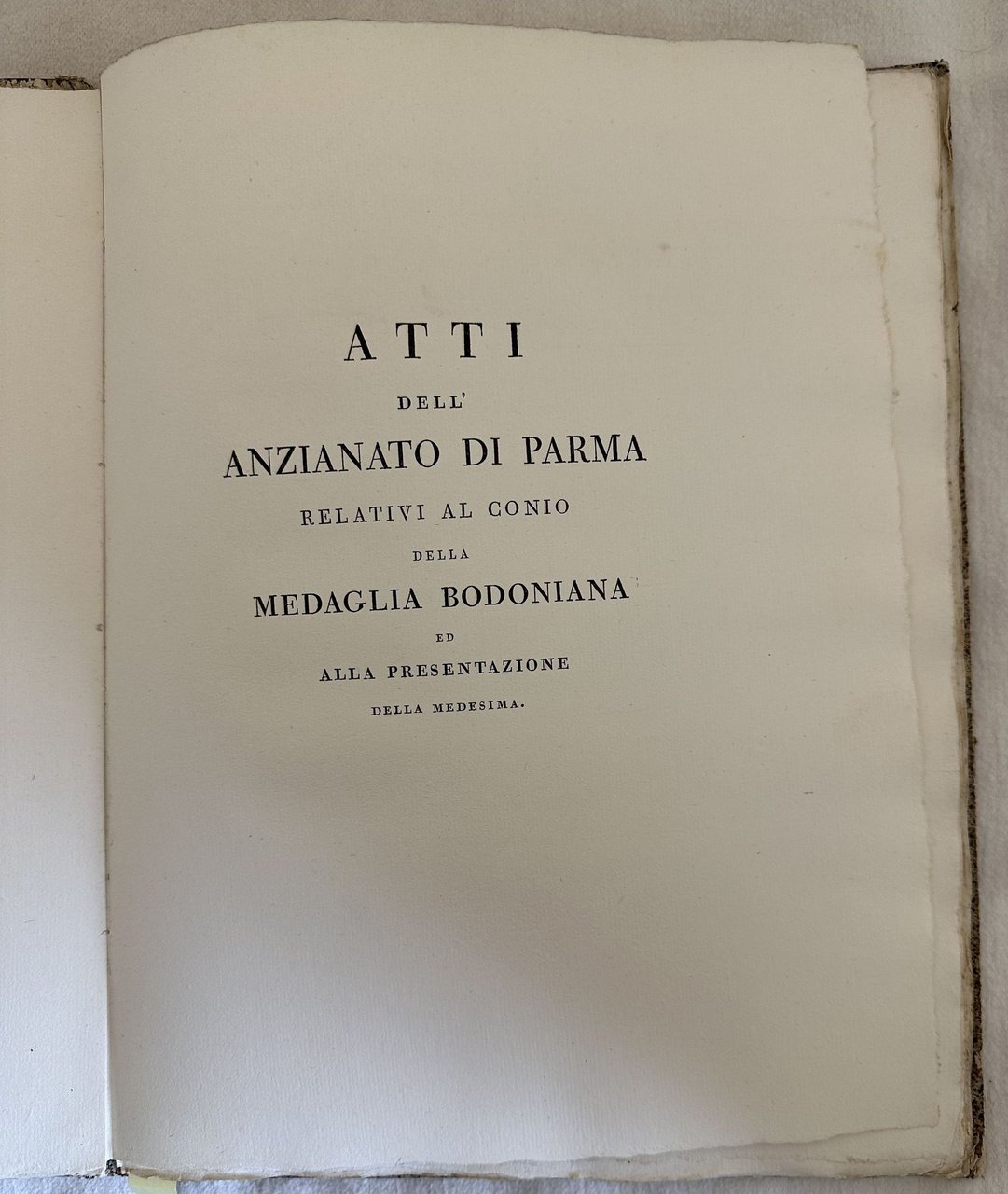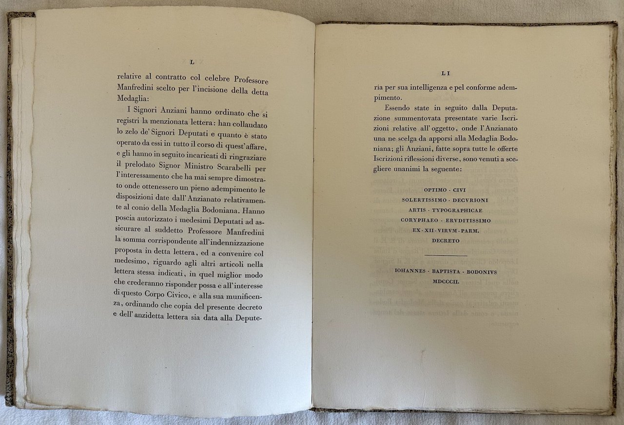 Finissima opera pubblicata in occasione della consegna della medaglia d'onore da parte del pubblico di Parma al celebre tipografo parmense Giambattista Bodoni (1740-1813) da Giacomo Tommasini (1768-1846) professore di fisiologia e patologia all'Università di Parma. Il nome dell'autore è a pagina XXIX. Senza indicazione di editore ma stampato da Bodoni (cfr. Brooks n. 993) Relazione dei motivi che determinarono il pubblico di Parma a decretare la medaglia bodoniana e del modo con cui fu eseguito il decreto. Seguono atti dell'Anzianato di Parma relativi al conio della Medaglia Bodoniana ed alla presentazione della medesima. Al frontespizio incisione in forma di medaglia col ritratto di Bodoni di Luigi Manfredini (1891-1965). Esemplare pulito in barbe. Finissima carta filigranata. Bellissimo ex libris al contropiatto anteriore. In buone condizioni. Copertina cartonata coeva in buone condizioni generali con lievi usure ai margini e mancanze al dorso. Legatura in buone condizioni con lievi rotture. All'interno le pagine si presentano in ottime condizioni con rare fioriture. In 4. Dim. 30,5x23 cm. Pp. (4)+LXXXIV. Peso Kg. 0,620. Very fine work punlished in occasion of the honour medal given by the people of Parma to the famous typographer Giambattista Bodoni (1740-1813) by Giacomo Tommasini (1768-1846) teacher of physiology and pathology in the University of Parma. the name of the author is in page XXIX. With no indication of editor but published by Bodoni (cfr. Brooks n. 993) Relazione dei motivi che determinarono il pubblico di Parma a decretare la medaglia bodoniana e del modo con cui fu eseguito il decreto. Seguono atti dell'Anzianato di Parma relativi al conio della Medaglia Bodoniana ed alla presentazione della medesima. In the title page engraving of a medal with the portrait of Bodoni by Luigi Manfredini (1891-1965). Clean copy. Uncut copy. Very fine phyligree paper. Very beautiful ex libris in the front counterplate. In good conditions. Carton coeval cover in good general conditions lightly worn in the extremities. Binding in good conditions with light cracks. Inside pages are in very good conditions with occasional foxing. In 4. Dim. 30,5x23 cm. Pp. (4)+LXXXIV. Weight Kg. 0,620.