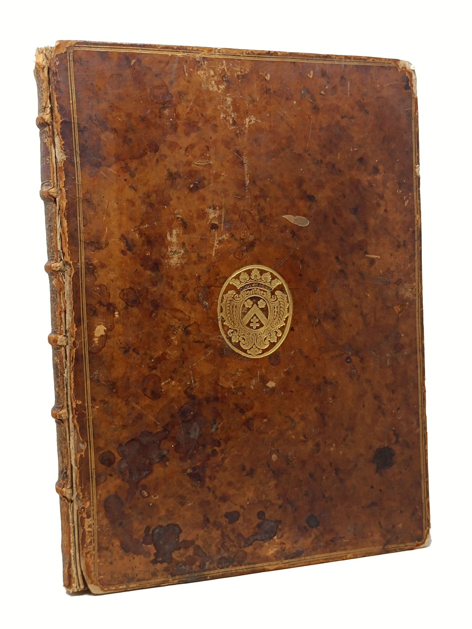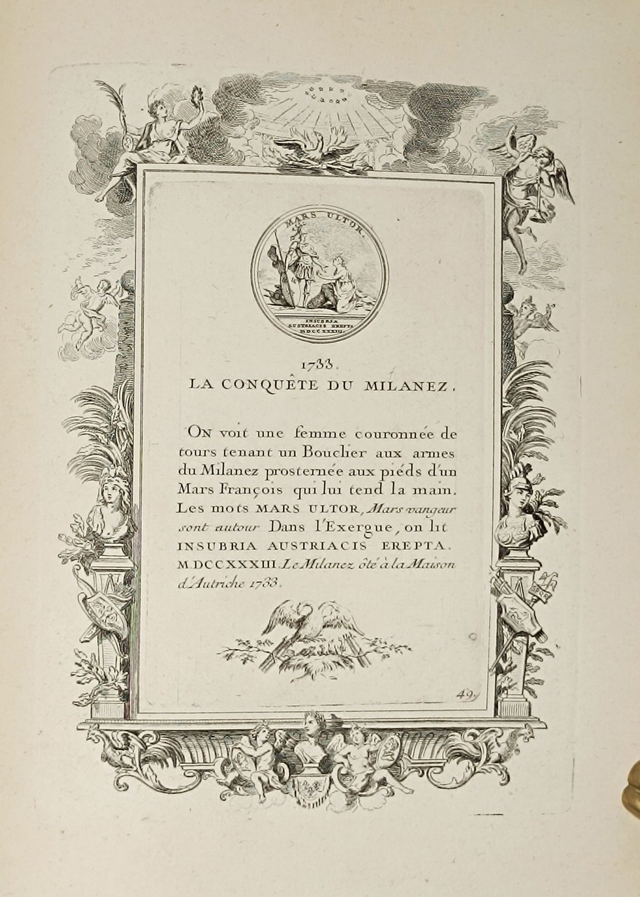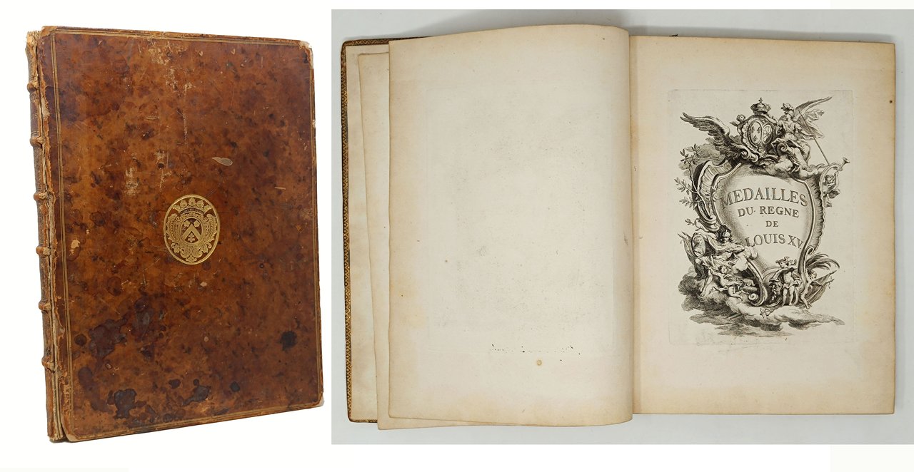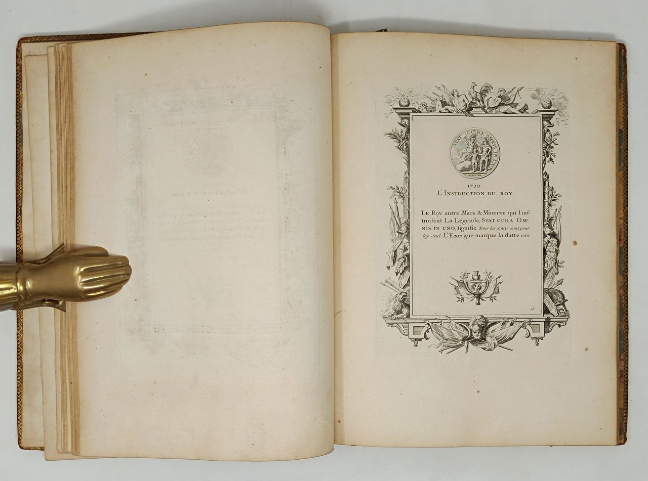 Senza indicazione di data [1736]. In-folio (24,5 x 33,5 cm circa). Lingua del testo: francese. Edizione originale con bel frontespizio illustrato da Le Moine e inciso da Cars. Pregevole la pagina del titolo con bella incisione a piena pagina. Nella pagina successiva a quella del titolo è presente un'altra bella incisione con cornice decorata e, all'interno, la dedica dell'opera al Re firmata (in stampa) dall'autore dell'opera, Godonnesche. Seguono le tavole finemente illustrate, numerate, ciascuna delle quali dedicata ad una medaglia. L'opera prevedeva 54 tavole ma, nell'esemplare in vendita, mancano le tavole numero 22, 38 e le ultime due: 53 e 54. Rilegatura in piena pelle con stemma nobiliare in oro su entrambi i piatti. Sei nervi in rilievo, titoli e decorazioni in oro sul dorso. Stato di conservazione: oltre allamancanza delle quattro tavole sopra citate, si segnala anche un taglio superficiale (che non inficia la rilegatura dei piatti e delle pagine) sulla cerniera della brossura, usure sugli angoli della coperta e sul margine inferiore e superiore del dorso, macchie (non deturpanti) sui piatti. Interno fresco. Privo di timbri, firme di appartenenza o altri segni nel testo. Rara prima edizione di un'opera che fu poi ristampata successivamente (nel 1745 con 65 tavole complessive e nel 1749 con 78 tavole).