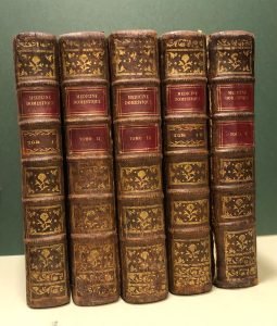 Opera completa in 5 volumi, piena pelle coeva con nervi e tassello al dorso. Pagg.CIV, 419,3; v, 560; 2, 610, 2; 2, 606; XXXVI, 587, 2. Piccolo timbro con nome di vecchio proprietario al piatto ant. di ciascun volume, firma manoscritta dello stesso al front. e note sempre d'epoca all'occhiello, Le cerniere interne di tutti i volumi sono state rinforzate con una striscia di nastro carta ( vedi foto), piccola galleria di tarlo al lato sup. interno di pagg. 279 fino a 300 circa, restauro al margine del piatto ant. del volume qunto, ma nel complesso l'opera è molto ben conservata