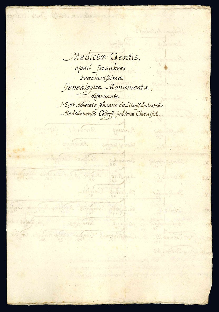 Mediceae Gentis apud Insubres Praeclarissimae Genealogica Monumenta, observante J.C., et Advocato Johanne de Sitonis de Scotia Mediolanesis Collegij Judicum Chronista (prima metà XVIII secolo).