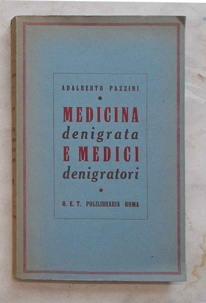 In 16° grande (cm. 19,5 x 12); pagg. 266; leggera cartonatura origin. Firma a penna. VG. ** Edizione originale. Non comune. Il celebre storico della medicina ripercorre la storia delle credenze, superstizioni e semplici -ma micidiali!- pettegolezzi che hanno ostacolato il lavoro dei medici. Ma l'Autore raccoglie e descrive anche la storia delle diatribe tra medici, accompagnate da odi e rancori. Questa "medicina senza pace" dovette fronteggiare durante tutta la sua lunga storia anche la "guerra ai medicinali". Infine un capitoletto che insegna "Come si fa a distinguere il medico buono da quello cattivo".