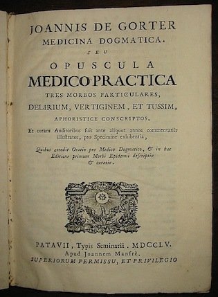 4to, (cm. 24,3), 6 cc.nn., 167 pp. Legatura coeva in piena pergamena con titolo oro su tassello dipinto al ds. Tagli screziati. Cuffia superiore mancante e parte sottostante del ds. mancanti, piatti leggermente deformati. Ottimi interni con fregi e iniziali ornate. Wellcome III, 139. De Gorter fu medico presso la zarina Elisabetta di Russia.