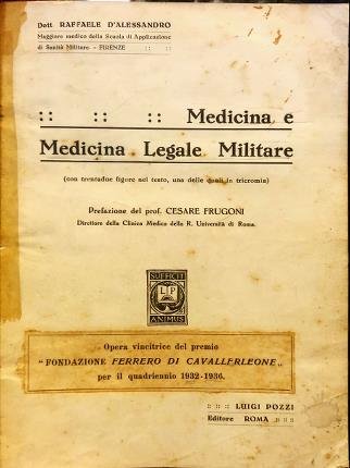 Con trentadue figure nel testo, una delle quali in tricromia. Prefazione del prof. Cesare Frugoni Direttore della Clinica Medica della R. Università di Roma. In 8° (cm 21,8 x 16,5), pp. [XII] + 428. Leg. mezza tela con angoli verde, piatti cart. marmorizzati verdi. Lievi segni di consunzioni ai margini e alle cuffie. Piccole abrasioni al piatto post. Fioriture ai tagli. Alcune pagine sono riparate con nastro adesivo. Gore diffuse. Numerosi segni, sottolineature e scritte a matita. Testo studiato. Discrete condizioni.
