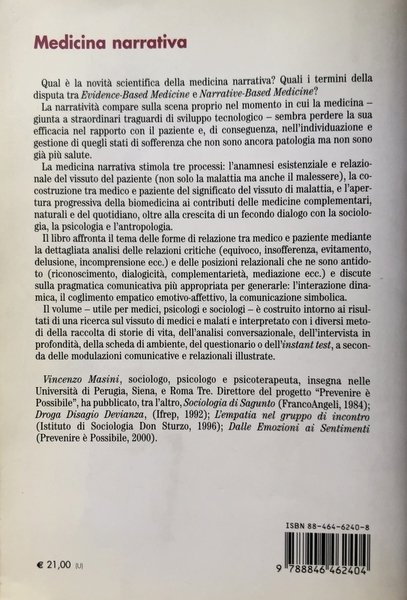(Narrazioni che spiegano, che sentono e che curano; La storia della ricerca; Narratività e pratica professionale; Lo scenario sociale che fa da sfondo al narrativo; Sociologia narrativa?; Sociologia sanitaria e approccio narrativo; La posta in gioco nella disputa tra Evidence-Based Medicine e Narrative-Based Medicine; La raccolta di storie con questionario di medicina narrativa; Gli stili di scrittura in medicina narrativa; Scrittura narrativa e terapia; Narratività ed etica; Anche la scrittura di principi è narrazione; Narratività e critica letteraria; Narratività e medicine complementari)
