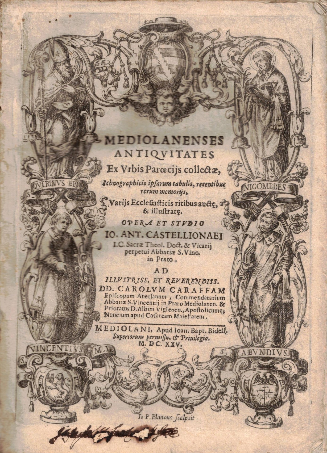 In-8 p. (mm. 235x165), cartonato muto settecentesco (lievi tracce duso al dorso), pp. (44),288,(22), bel frontesp. con stemmi e figure dei Santi Quirino, Vincenzo, Nicomede ed Abbondio, inc. in rame da G.P. Bianchi; illustrato da numer. inc. in rame e in legno nel testo (medaglie, reperti archeologici, iscrizioni, ecc., oltre alla pianta della Basilica Vicenziana: Tabula I, a p. pag.). Mancano lultima c.b. e la carta topografica fuori testo Dedica al vescovo di Aversa Carlo Caraffa. Le pagine preliminari contengono svariati componimenti poetici in latino in onore dell'A. e del Caraffa. Nelle intenzioni dell'autore l'opera avrebbe dovuto essere molto più ampia: si pubblicò invece solo questa prima parte (delle due previste) col titolo specifico "Antiquitatum Paroeciae D. Vincentii in Prato florilegium duas in partes distributum". "Prima edizione", assai importante per la storia archeologica e religiosa di Milano. L'autore, sacerdote milanese morto in occasione della peste di Milano del 1630, fu attento ricercatore degli antichi monumenti ecclesiastici della sua città e la sua opera ne rappresenta l'immagine e ne da la descrizione.Cfr. Argelati,I,p. I, p. 371: "In hoc Opere agitur praecipue de ejusdem Basilicae Antiquitatibus, & multa continentur ad Mediolanensem historiam cognoscendam aptissima" - Cat. Hoepli,622 - Predari,106 - Coleti,115.39 - Lozzi,I,2606 (note) .Lieve alone solo su 2 cc. centrali; al frontespizio due piccoli buchi al margine inferiore e firma di appartenenza cancellata, peraltro bellesemplare.