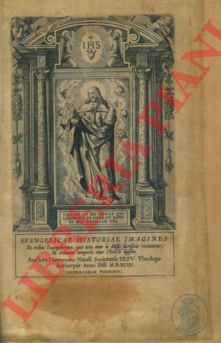 Roma, appresso Luigi Zannetti, 1599, folio (cm. 32 x 22) rilegato in piena pergamena moderna, muta, marca tipografica xilografica al frontespizio, 153 cc. di testo (stampate solo al verso; testo inquadrato in filetto tipografico, con capolettere e finali xilografici) a fronte di 153 cc. (stampate solo al recto) con meravigliose tavole calcografiche a piena pagina + una pagina di Errata. Prima del frontespizio compaiono il frontespizio architettonico (con il Cristo al centro), inciso in rame, dell'“Evangelicae historiae imagines.” del Nadal (Antuerpiae, 1593) e 2 cc. con epistola al lettore e indice italiano (“Tavola delle meditationi che respondono all'imagini della vita di Christo secondo l'ordine del Historia Evangelia”). La copia fa dunque parte della tiratura convenzionalmente indicata “C” (cfr. ICCU). L'apparato iconografico, di straordinaria fattura, è stato concepito dal Nadal, pare sotto la supervisione diretta del Loyola (comunque sia, si trattava di un progetto decisivo per i gesuiti), ed è stato in gran parte inciso, dietro pagamento di una somma altissima, da Anton, Jan e Jerome Wierix (che erano tra i più celebri incisori del tempo), su disegni di Marten de Vos, Bernardo Passeri e altri. Forti restauri ai margini bianchi del frontespizio architettonico e delle ultime 5 cc.; peraltro, carta lievemente e uniformemente brunita, rade e leggere fioriture, ma buona copia, completa. Edizione originale dell'adattamento in lingua italiana del Vivaldi. Graesse, IV, 649.