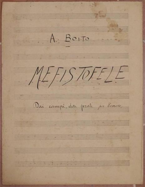 Formato cm. 28,5x22. Bello spartito manoscritto degli anni '30 del prologo di "Mefistofele" di Arrigo Boito. La partitura per pianoforte è composta da quattro fogli dei quali tre manoscritti e presenta note e canto. In buone condizioni. Beautiful manuscripted musical score of 1930's of the prologue of "Mefistofele" by Arrigo Boito "Dai campi ai prati" for tenore. The musical score for piano is made up of four pages of which three are manuscripted and has notes and song. In good conditions.