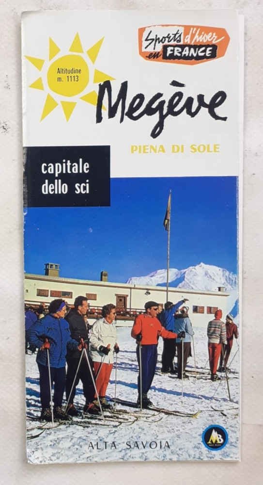 Pieghevole stampato su carta lucida "laccata", di 10 facciate di cm. 22 x 10,5; con un panorama a volo d'uccello a colori su due facciate con impianti e discese e numer. illustraz. fotograf.a colori. VG. ** In italiano. Allegati tre pieghevoli: "Liste des Hotels" (8 facciate, con pianta della città, in francese), "Tariffe in nuovi Franchi; informazioni generali inverno 1962-63" (6 facciate, in italiano), "Forfait skieur Megève" (4 facciate, in francese).