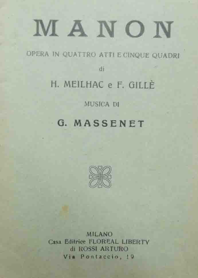Manon. Opera in quattro atti e cinque quadri, di H. Meilhac e F. Gillè, musica di G. Massenet, Casa Editrice Floreal Liberty di Rossi Arturo, Milano s.d., pp. 32, cm 18, pubblicazione spillata. Firma d’appartenenza al frontespizio. Leggere sgualciture, minima brunitura della carta, per il resto buona copia.