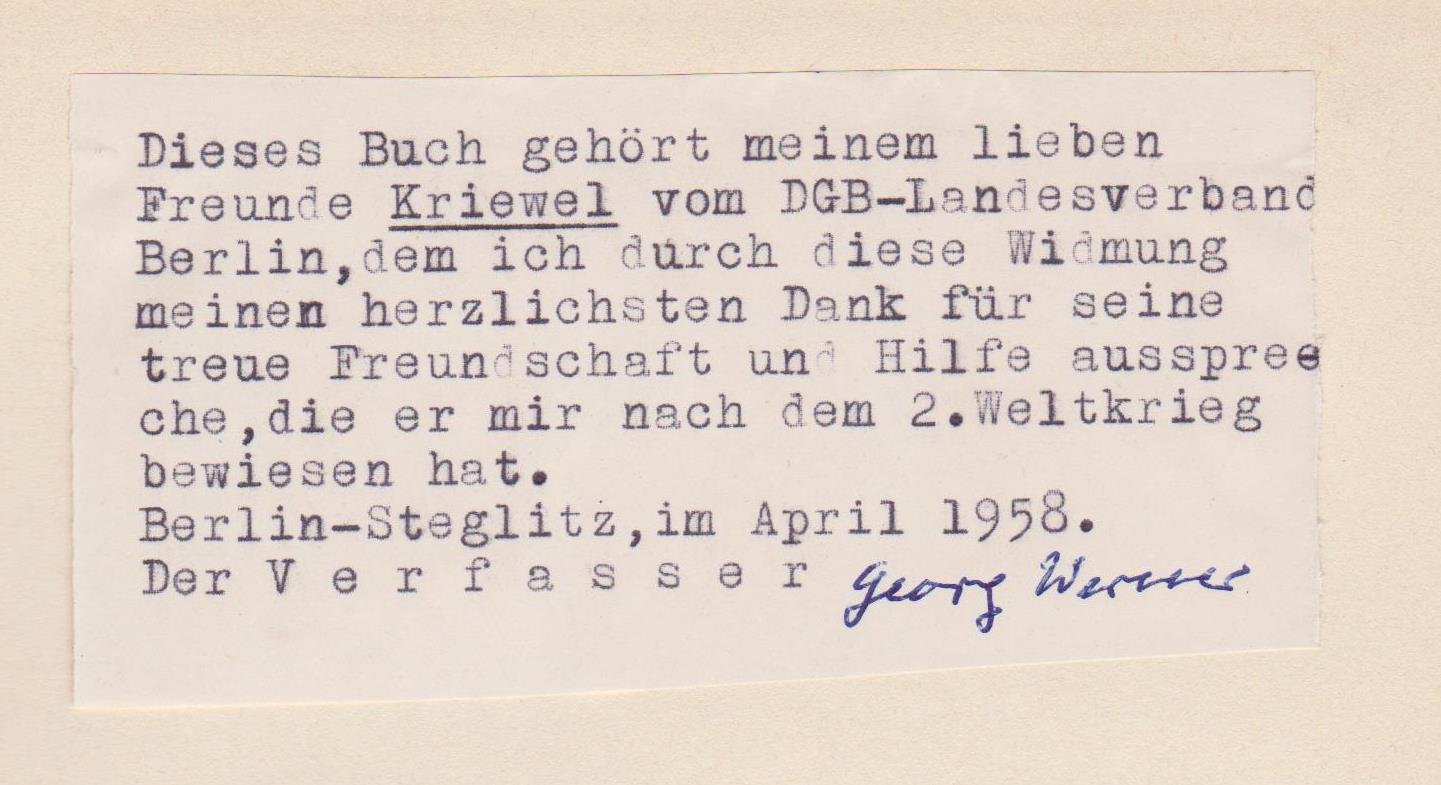 Mit persönlicher, signierter Widmung des Verfassers. Untertitel: "Was mich die achtzig Jahre von 1877 bis 1957, in denen die großen sozialen, wirtschaftlichen und politischen Wandlungen, die beiden Weltkriege und die Hitlerzeit liegen, gelehrt haben". Autobiographie des Autors, der in Bergbaugewerkschaften tätig war und von 1925 bis 1933 "Die Knappschaft" herausgab, die 1933 verboten wurde.