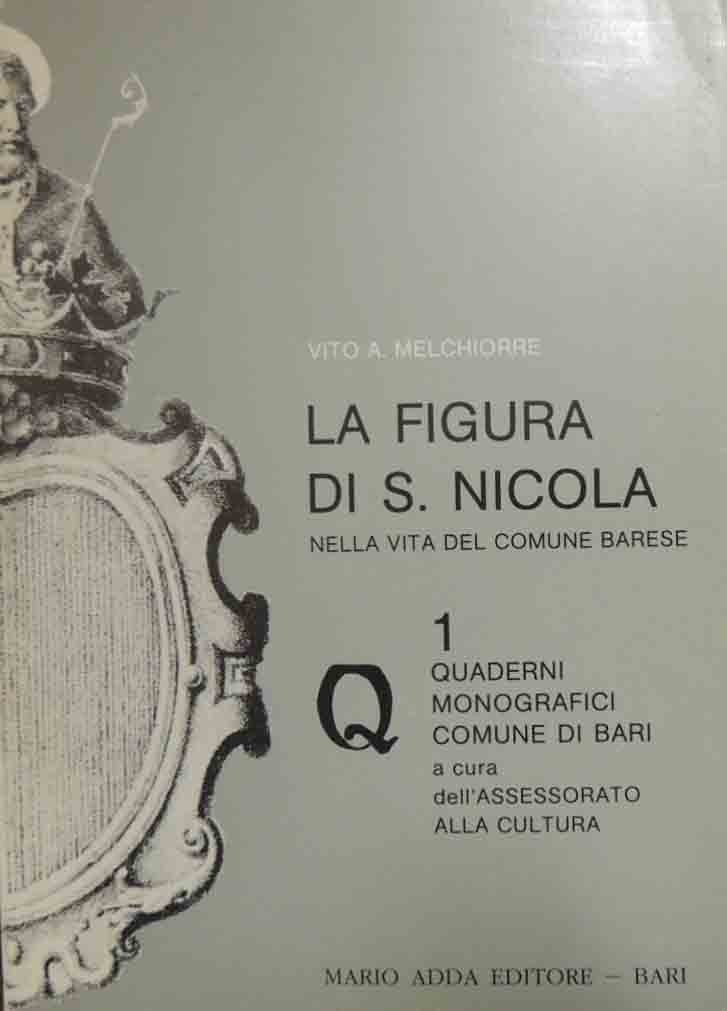 Vito A. Melchiorre, La figura di S. Nicola nella vita del comune barese, Mario Adda Editore, Bari 1984, pp. 95, ill. b.n., 2 c. di tavv. f.t. ill. col., cm 21, br. ed. Collana Quaderni monografici del Comune di Bari, a cura dell’Assessorato alla Cultura, n. 1. Minime tracce d’uso alla brossura, per il resto perfetto.