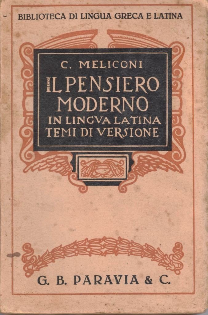 Meliconi, Il pensiero moderno in lingua latina. Temi di versione con regole ed osservazioni. Ad uso della Scuola Media Superiore, G. B. Paravia e C., Torino 1932, quarta rist., pp. VIII, 167, cm 21, br. ed. Collana Biblioteca di lingua greca e latina. Firma d’appartenenza a una delle carte interne. Tracce d’uso alla brossura, minime fioriture, leggera brunitura della carta, per il resto e nel complesso buona copia, pulito e ben tenuto l’interno.