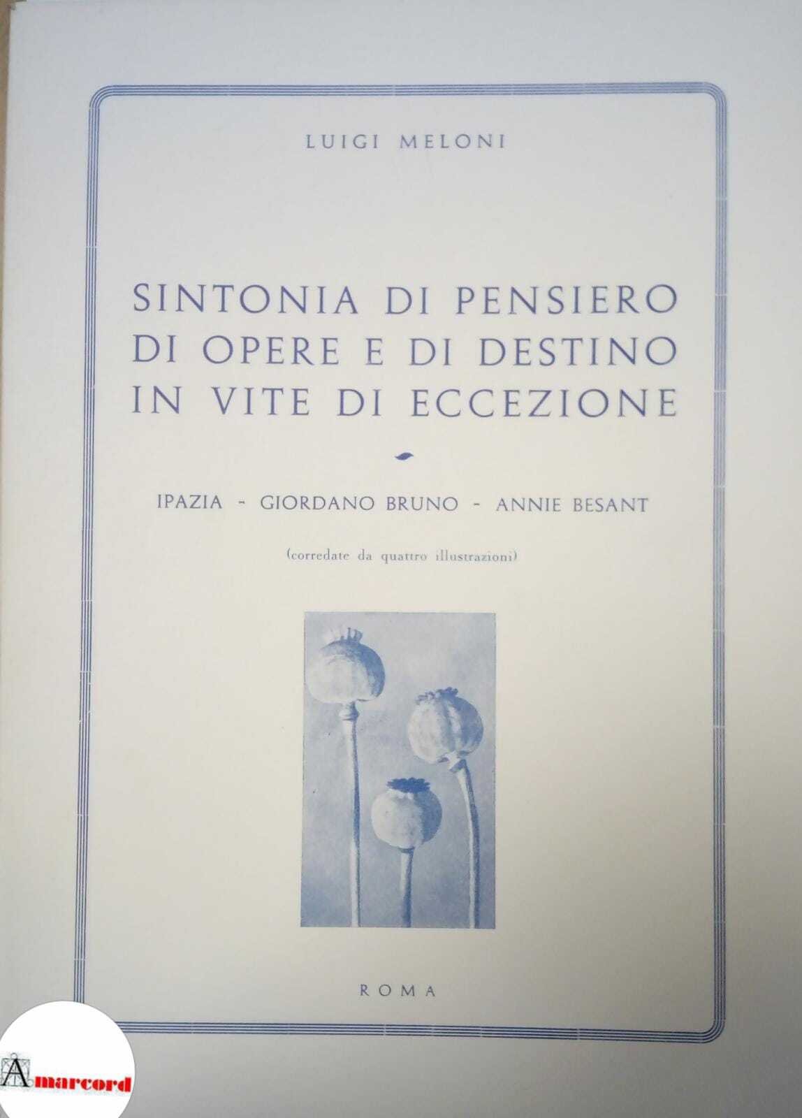Meloni Luigi, Sintonia di pensiero di opere e di destino in vite di eccezione. Ipazia Giordano Bruno Annie Besant, Roma, 1960 - I, in-8, brossura, pp. 44, ottimo.
