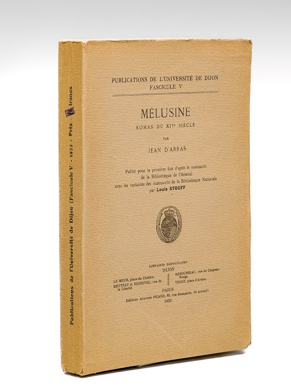 Publié pour la première fois d'après le manuscrit de la Bibliothèque de l'Arsenal avec les variantes des manuscrits de la Bibliothèque Nationale, par Louis Stouff, 1 vol. grand in-8 br., Publications de l'Université de Dijon, Fascicule V, Imprimerie Bernigaud et Privat, Dijon, 1932, XIII-382 pp. Bon exemplaire en très bon état. Il ne faut pas confondre ce volume, qui contient le texte de Jean d'Arras, avec l'Essai publié en 1930 par Louis Stouff.