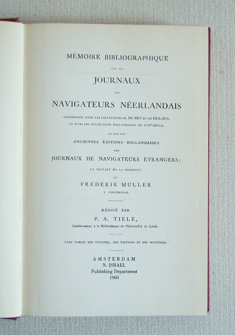 Mémoire Bibliographique sur les Journaux des Navigateurs Néerlandais Réimprimés dans les Collections de De Bry et de Hulsius, et dans les Collections Hollandaises du XVII° Siècle, et sur les Anciennes éditions Hollandaises des journaux de navigateurs étrangers; La plupart en la possession de Frederik Muller a Amsterdam. Rédigé par.