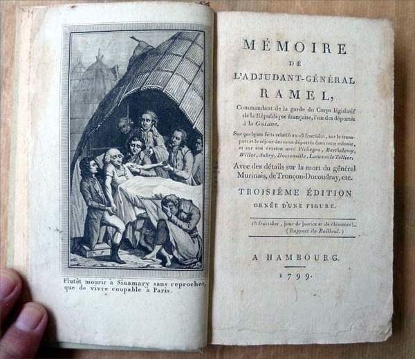 Mémoire de l'Ajudant-Général Ramel, Commandant de La Garde du Corps Législatif de La République Française, l'un des Déportés à la Guiane. Sur quelques faits relatif au 18 fructidor, sur le transport et le séjour des seize déportés dans cette colonie, et sur son évasion avec Pichegru, Barthélémy, Willot, Aubry, Dossonville, Larue et Letellier. Avec des détails sur la mort du général Murinais, de Tronçon-Ducoudray, etc. Troisième édition ornée d'une figure.
