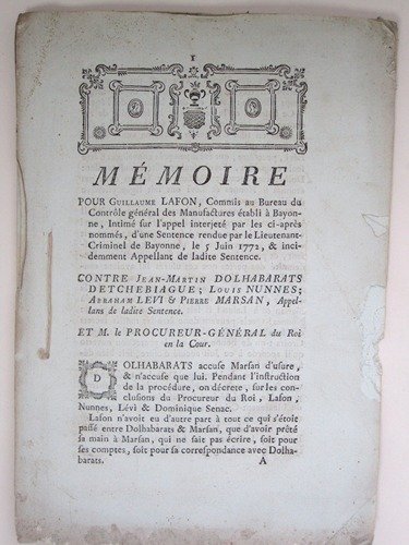 Mémoire pour Guillaume Lafon, Commis au Bureau du Contrôle Général des Manufactures établi à Bayonne, intimé sur l'appel interjeté par les ci-après nommés, d'une Sentence rendue par le Lieutenant-Criminel de Bayonne, le 5 juin 1772, & incidemment Appelant de ladite sentence. Contre Jean-Martin Dolhabarats Detchebiague ; Louis Nunnes ; Abraham Levi & Pierre Marsan, appelans de ladite sentence, et M. le Procureur Général du Roi en la Cour, 1 vol. in-4 br., sans couv., s.d. (1772), 32 pp. Intéressant mémoire en défense sur une affaire d'usure, mettant en cause le fils d'un Maître Orfêvre de la ville de Bayonne. Etat moyen (grignotage en marge sans aucune atteinte au texte).