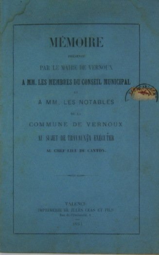 Mémoire présenté par le Maire de Vernoux à MM. les membres du Conseil Municipal t à MM. les notables de la commune de Vernoux au sujet de travaux à exécuter au chef-lieu de canton
