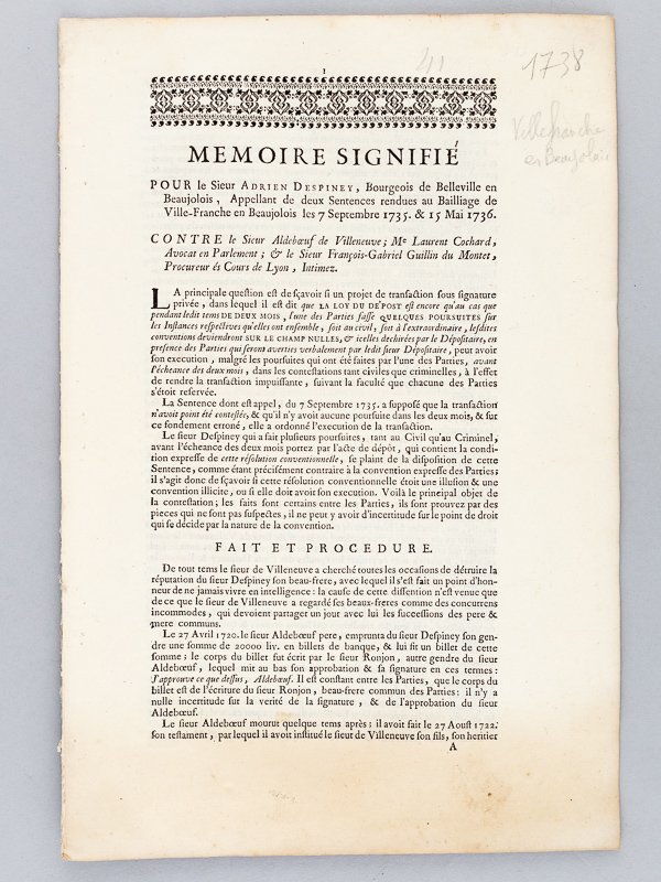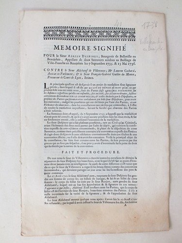 1 brochure in-folio, De l'Imprimerie de la Veuve d'André Knapen, au bas du Pont Saint Michel, 1738, 11 pp. : Mémoire Signifié, pour le Sieur Adrien Despiney, Bourgeois de Belleville en Beaujolois [ Belleville en Beaujolais ], appellant de deux Sentences rendues au Bailliage de Ville-Franche en Beaujolois [ Villefranche en Beaujolais ], les 7 Septembre 1735 & 15 Mai 1736. Contre le Sieur Aldeboeuf de Villeneuve ; Me Laurent Cochard, Avocat en Parlement ; & le Sieur François-Gabriel Guillin du Montet, Procureur és Cours de Lyon, Intimez. "De tout tems, le sieur de Villeuneuve a cherché toutes les occasions de détruire la réputation du sieur Despiney son beau-frère, avec lequel il s'est fait un point d'honneur de ne jamais vivre en intelligence : la cause de cette dissention n'est venue que de ce que le Sieur de Villeneuve a regardé ses beaux-frères comme des concurrens incommodes, qui devoient partager un jour avec lui les successions des pére et mère communs". Bon état (papier lég. bruni en queue).
