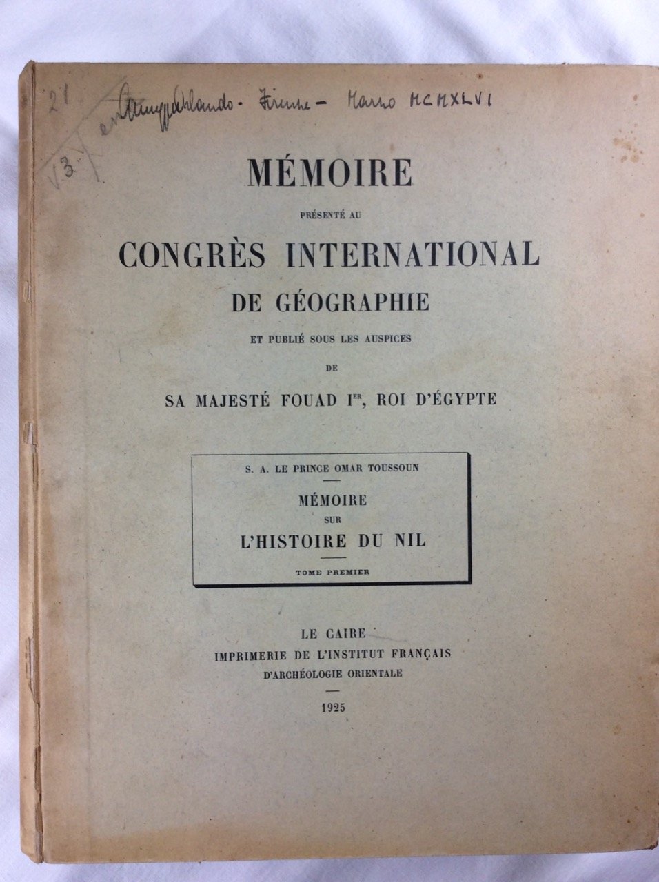 MEMOIRE SUR L'HISTOIRE DU NIL. - Mémoire présenté au Congrès International de Géographie et publié sous les auspices de Sa Majesté Fouad I, Roi d'Egypte.