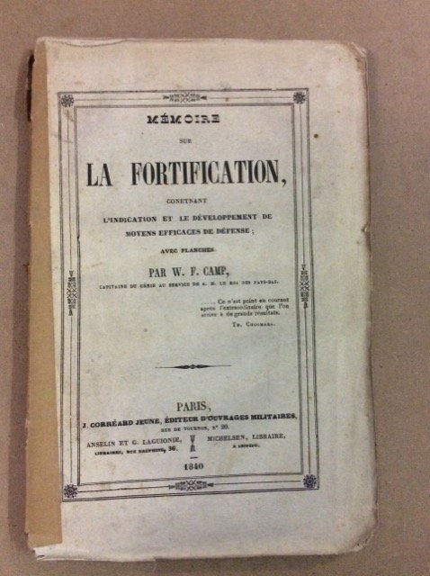 In-8 p., brossura (dorso restaurato), pp. (4),133,(3), con 2 tavole in 1 (cm. 66x86) che raffigurano "murailles isolées à contreforts voutés, etc. appliquées au système bastionné..". Esemplare con barbe. Con lievi fioriture. Testo in buono stato (sligthly foxed, text in good condition).