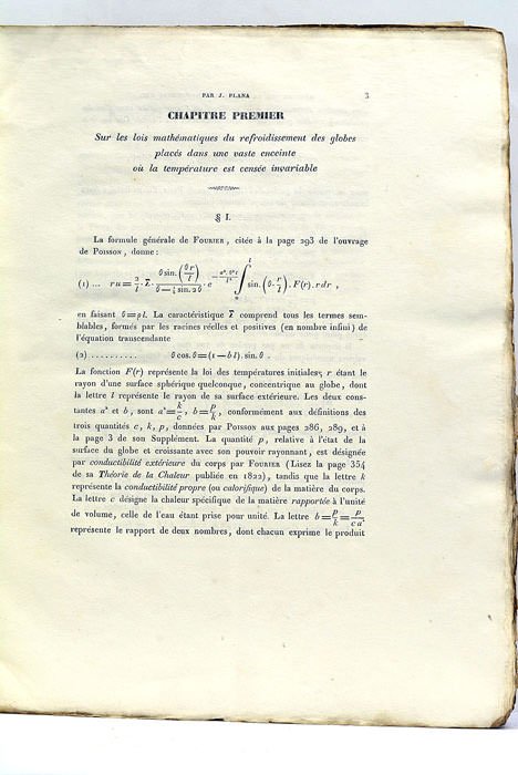 81 pages. (31x21,5 Cm). Broché. Couverture muette de l'époque. Dos fendu. Petits manques de papier. Taches et petits accrocs. Rare mémoire de l'astronome italien le Baron Plana. Membre de plusieurs sociétés savantes il entretint une correspondance avec les grands hommes de science de son temps. Tiré-à-part très rare des "Mémoires de l'Académie des Sciences de Turin". Bon exemplaire grand de marges, non rogné. Rares taches et rousseurs. Envoi de l'auteur à Monsieur Joseph Liouville sur le premier feuillet.