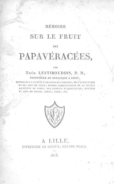 A Lille, imprimerie de Leleux, 1823. Plaquette in/8 cousue, couverture imprimée, 16 pages. Couverture défraîchie : taches et rousseurs. Tranches non massicotées. Gaspard Thémistocle Lestiboudois (1797 - 1876) fut un médecin, un botaniste et homme politique français. Fils du botaniste François-Joseph Lestiboudois et petit-fils de Jean-Baptiste Lestiboudois (1715 -1804), professeur de botanique à la faculté des sciences de Lille. Il obtient son titre de docteur en médecine en 1818 à Paris. Il se rend en Algérie pour y étudier l’épidémie de peste de 183. Il présente à la Faculté des sciences de Paris une thèse de botanique en 1848 sur la phyllotaxie anatomique (ordre dans lequel sont implantés les feuilles ou les rameaux sur la tige d’une plante, ou, par extension, la disposition des éléments d’un fruit, d’une fleur, d’un bourgeon ou d’un capitule). La présente plaquette traite de la famille des pavots, coquelicot.
