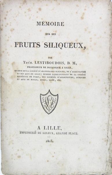 A Lille, imprimerie de Leleux, 1823. Plaquette in/8 en feuilles, couverture imprimée, 16 pages. Auréole et rousseurs.Gaspard Thémistocle Lestiboudois (1797 - 1876) fut un médecin, un botaniste et homme politique français. Fils du botaniste François-Joseph Lestiboudois et petit-fils de Jean-Baptiste Lestiboudois (1715 -1804), professeur de botanique à la faculté des sciences de Lille. Il obtient son titre de docteur en médecine en 1818 à Paris. Il se rend en Algérie pour y étudier l’épidémie de peste de 183. Il présente à la Faculté des sciences de Paris une thèse de botanique en 1848 sur la phyllotaxie anatomique (ordre dans lequel sont implantés les feuilles ou les rameaux sur la tige d’une plante, ou, par extension, la disposition des éléments d’un fruit, d’une fleur, d’un bourgeon ou d’un capitule).