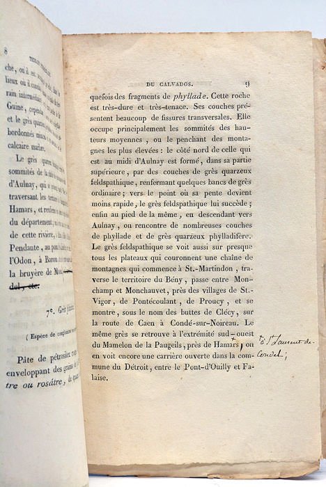 23 pages. (21x13,5 Cm). Broché, couverture muette d'origine. Petites déchirures. Mémoire de géologie décrivant les variétés de roches composant le terrain intermédiaire en divers endroits du Calvados. Exemplaire d'épreuves comportant diverses corrections de la main de l'auteur. Petites rousseurs.