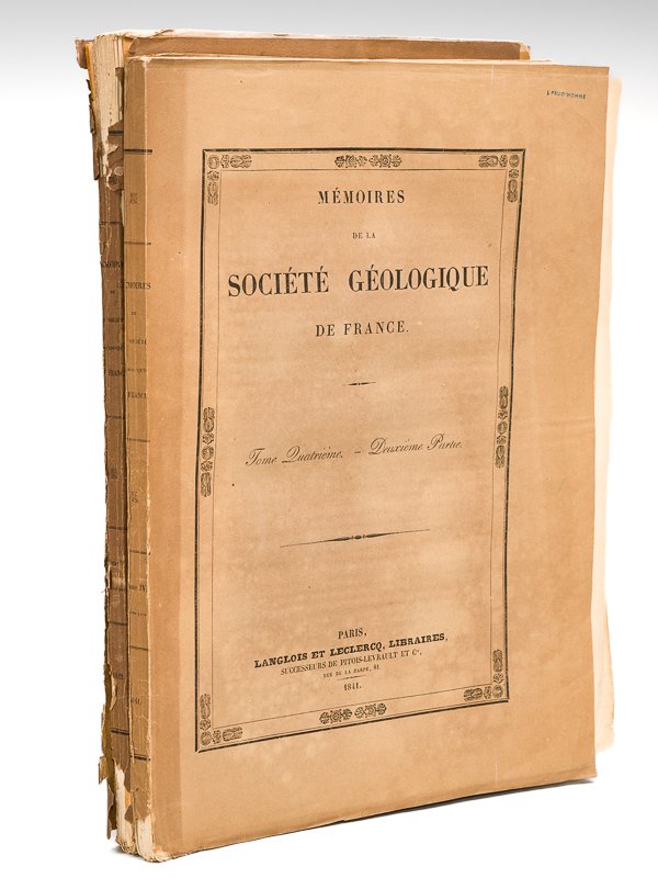 2 vol. grand in-4 br., Mémoires de la Société Géologique de France. Tome Quatrième - Deuxième Partie, Langlois et Leclercq, Paris, 1841, pp. 230-364 avec 4 planches lithographiées dépliantes en couleurs et une planche lithographiée, et 1842, 127 pp. avec 10 planches lithographies hors texte dont 2 dépliantes. Rappel du titre complet : Mémoire sur les Terrains crétacés inférieur et supra-jurassique de l'arrondissement de Vassy (Haute-Marne) [Suivi de : ] Mémoire sur le terrain crétacé du département de l'Aube, contenant des considérations générales sur le terran Néocomien (Mémoires de la Société Géologique de France. Tome Quatrième - Deuxième Partie) [ On Joint : ] Mémoire sur le terrain crétacé du département de l'Aube, contenant des considérations générales sur le terran Néocomien. Suite [Suivi de : ] Journal d'un Voyage dans la Turquie d'Europe (Mémoires de la Société Géologique de France. Tome Cinquième - Première Partie) Rare exemplaire de l'édition originale, bien complète des 15 planches hors texte dont les 4 belles planches dépliantes rehaussées en couleur. Etat satisfaisant (petite mouill. en queue et petit mq. de papier au dos en queue pour le premier volume, couv. abîmée avec mq. et mouill. pour le second volume, cachet d'ex-libris, bon état par ailleurs).