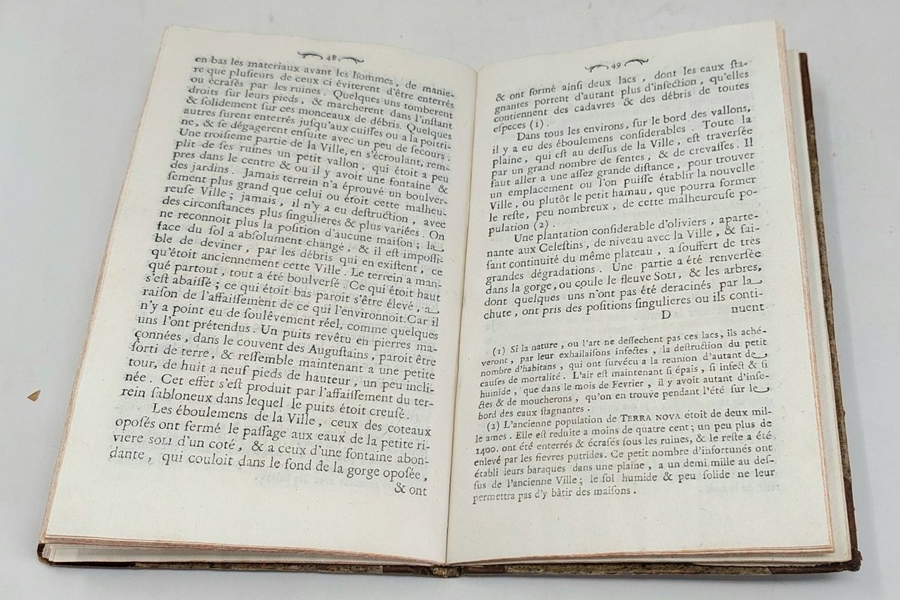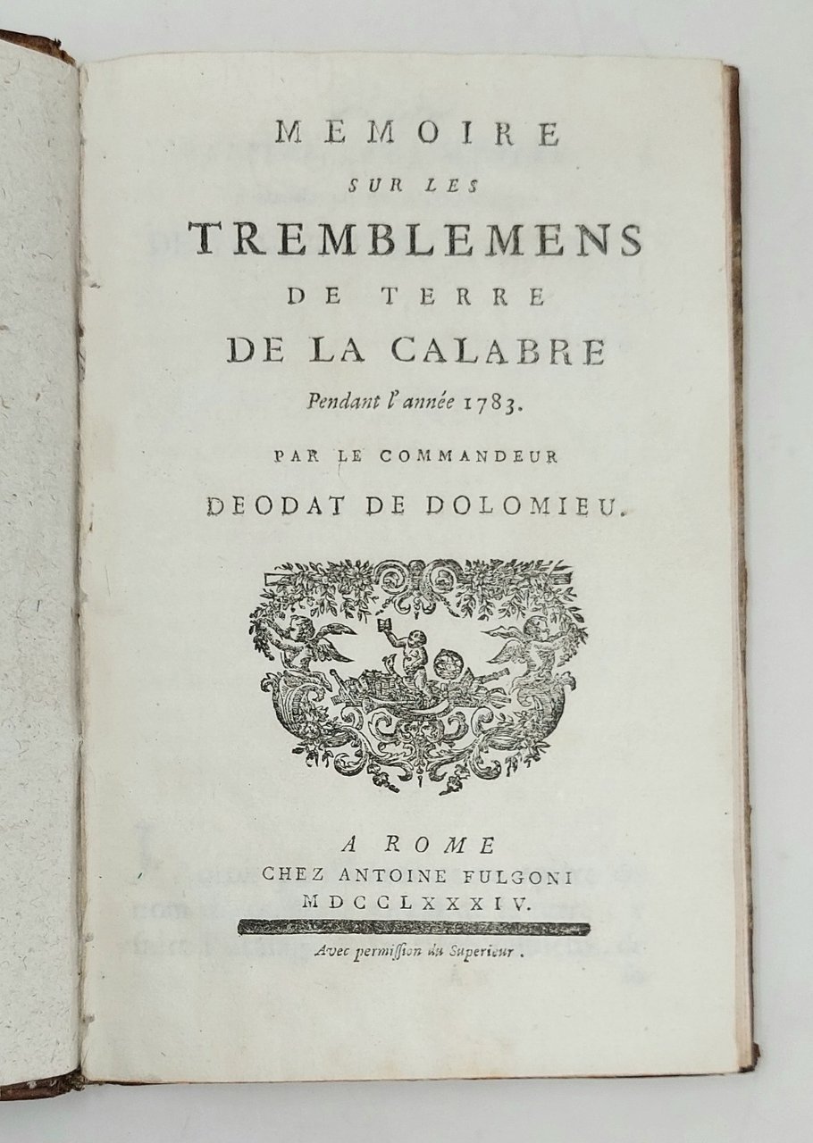 >in-8 (192x123 mm), pp. 70. Legatura in mezza pelle ed angoli, piatti in carta marmorizzata. Il celebre geologo delle Alpi, che nel 1781 aveva scalato l'Etna e visitato l'arcipelago di Aelion, viaggiò nel febbraio e marzo 1784 nella zona colpita dal disastroso terremoto del 1783. La sua attenzione si concentra su aspetti trascurati nei numerosi opuscoli e cronache pubblicati su questo evento, e spiega scientificamente gli effetti eccezionali delle violente scosse sul paesaggio e sulla natura del paese. “La metodologia scientifica di Dolomieu, espressa attraverso le sue ricerche sui vulcani italiani, adottava gli elementi essenziali della geologia della fine del XVIII secolo: il viaggio scientifico e il lavoro dettagliato sul campo; le competenze mineralogiche e la conoscenza pratica delle miniere; lo studio comparato delle montagne e dei vulcani [...] La percezione della grande complessità, del numero e della varietà dei fenomeni geologici aveva allontanato Dolomieu dalle teorie generali della Terra. Egli cercò la soluzione ai problemi geologici attraverso i viaggi. Per questo motivo, invece di riferirsi a modelli teorici generali, introduceva costantemente domande sui problemi che emergevano dal lavoro sul campo” (E. Vaccari, p. 42). Ottimo esemplare. Baratta, p. 885; L. Zanzi, Dolomieu. Un avventuriero nella storia della natura, Milano 2003; J. Gaudant (ed.), Dolomieu et la géologie de son temps, Paris 2005; M. Pinault-Sørensen, Images du désastre de Messine, 1783 in A. M. Mercier Faivre-C. Thomas (eds.), L’invention de la catastrophe au xviiie siècle. Du chatîment divin au désastre natural, Genève 2008, p. 360-366; E. Vaccari, “Volcanic Travels“ and the Development of Volcanology in 18th Century Europe, “Proceedings of the California Academy of Sciences“, 59 (2008), Suppl. i, pp. 37-50.