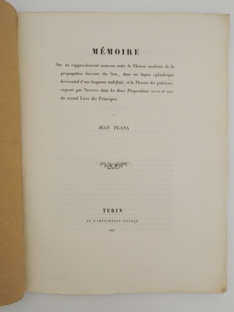 4°, pp. 84, brossura cartacea colorata, esemplare in barbe a carte intonse, bella copia con dedica della figlia dell'autore, Sophie Plana, a Giuseppe Bartolomeo Erba. Estratto da: Mémoires de l'Academie des sciences de Turin, Ser. 2., t. 18. Due copie in ICCU. *** TUTTI I NOSTRI LIBRI SONO VISIBILI PREVIO CONTATTO MAIL O TELEFONO NELLA NUOVA SEDE DI MILANO: LIBRERIA COSMOPOLIS, VIA JOMMELLI, 22. ***