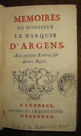 12mo (cm. 15,6), 2 cc.nn., 296 pp. Dopo le Memorie, si trovano XIV ‘Lettres’ con Errata finale. Legatura antica in mz. pelle con nervi, fili e titolo oro su tassello rosso al ds. Timbretto e firma di appartenenza al frontis. Piatti un po’ usurati. Piccoli fori di tarlo che non interessano le carte interne, ma in minima parte il ds. e le sguardie. Tagli rossi. Sono gli scritti giovanili del D’Argens, con interessanti osservazioni di diverso genere (sulle cortigiane, sugli Italiani, sulla religione dei Turchi, sugli Olandesi, ecc.). Raro.