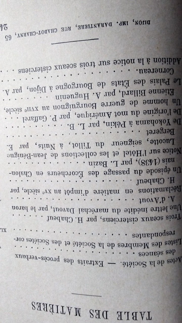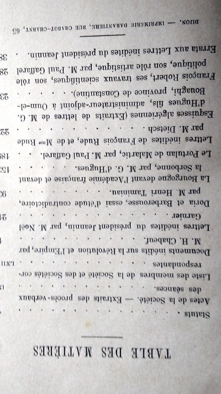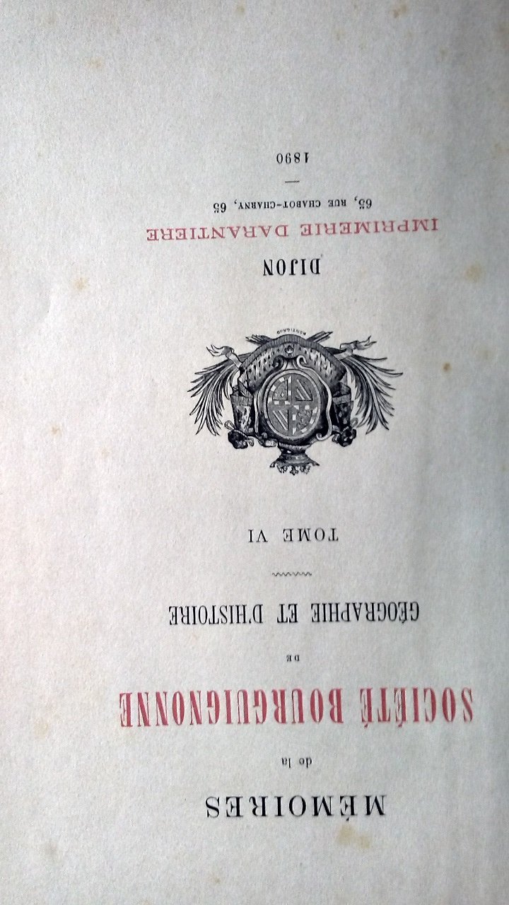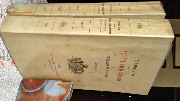 Due volumi in 8 grande, brossure editoriali, titolo ai piatti ed ai dorsi, sguardie, occhielli, frontespizi in due colori con bella marca silografica, LXXXVI, 379, LXVII, 368 pp., in entrambi carte d'indice, tavole ft. Raccolta di ottimi saggi su vari argomenti storico filologici e geografici con particolare riferimento in alcuni alla regione della Borgogna. Rinomati i vari Autori, segnalande le loro digressioni. In ottimo stato, davvero poco comuni, di grande interesse. Particolarmente da segnalare l'elenco dei soci dell'esimio Consesso riportati in entrambi i tomi. Notevole insieme