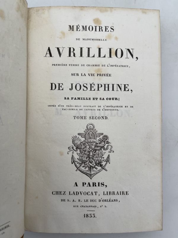 Ladvocat 1833 A Paris, chez Ladvocat, 1833. 2 volumes In-8 reliés demi-basane blonde de VIII + 391 + 452 pages. Dos lisses à filets dorés. Bien complet du portrait de l'Impératrice en frontispice et des fac-similés de lettres de l'Empereur. Manque de cuir en pied du tome 2, épidermures, quelques rousseurs en début des ouvrages, frontispice en partie détaché. Malgré les défauts signalés, bon exemplaire.
