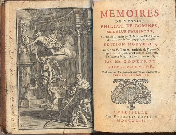 Memoires de messire Philippe de Comine, seigneur d'Argenton, contenans l'histoire des Rois Louis XL e Charles VIII depuis l'an 1464 jusques en 1498. Edition nouvelle divisee en V tomes, enrichie de figures & augmentee de plusieurs traittez, contrats, testamens & autres pieces nouvelles, par Mr. Godefroy.