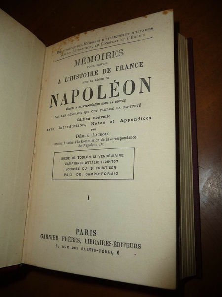 TITOLO: MEMOIRES POUR SERVIR A L'HISTOIRE DE FRANCE SOUS LE REGNE DE NAPOLEON ECRITS A SAINTE-HELENE SOUS SA DICTEE PAR LES GENERAUX QUI ONT PARTAGE SA CAPTIVITE DESCRIZIONE: Ed. Garnier Frères, Parigi, 1904. In 16°, leg. ed. s.pelle rossa con tit. oro al dorso, pp. 557 + 584 + 467 + 505 + 477 con diverse cartine b/n n.t. anche ripiegate Indice: VOL. I - Siège de Toulon 13 Vendèmiare; Campagnes d'Italie 1796-1797; Journée du 18 Fructidor; Paix de Campo-Formio. VOL. II - Campagnes d'Italie; Egypte; Politique du Directoire; Situation Politique de l'Europe en 1798; Seconde Coalition Contre la France; 18 Brumaire; Vendée. VOL. III - Genes; Massena; Marengo; Ulm; Moreac; Diplomatie; Guerre; Neutres; Saint-Domingue; Les Quatre Concordats. VOL. IV - Retour de L'Ile d'Elbe; Etat Militaire de la France; Campagne de 1815; Ligny; Waterloo; Abdication. VOL. V - Précis sur les Guerres; De Jules César; Du Maréchal de Turenne de Frédéric II. CONDIZIONI: Molto buone, alcune fioriture e leggere abrasioni ai dorsi. PESO / WEIGHT: 1930 gr. without package