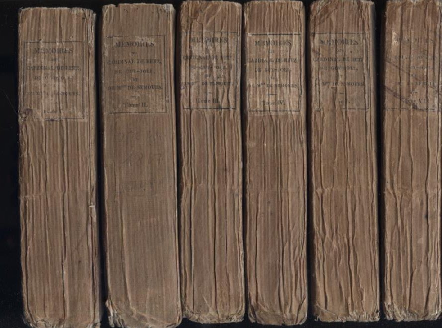 6 voll. in-8° (185x105mm), pp. e 517; 501; 427; 433; 474; 416; brossura originale decorata con titolo a stampa su tassello cartaceo ai dorsi. Ritratto del Cardinale di retz inciso su rame da Chasseleur all'antiporta del primo vol. Fioriture normali. Buona copia in barbe. Reimpressione ottocentesca (prima edizione con il luogo di Parigi dichiarato; le precedenti edizioni, a cominciare dall'originale del 1717 di Amsterdam, erano state tutte pubblicate all'estero o con falsi luoghi di stampa) di uno dei capolavori della memorialistica francese, fonte importantissima per la storia di Francia nel Grand Siècle, qui integrate dai Mémoires del Guy Joli, segretario del Cardinale di Retz. Particolare rilievo ha la rievocazione degli eventi della Fronda, in cui lo stesso futuro Cardinale ebbe parte assai rilevante, in quanto egli fu, con Bouillon e Turenne, uno dei capi della ribellione che si chiuse nel marzo 1649 con la Pace di Rueil. 'Queste memorie sono scritte con un'aria di grandezza, una impetuosità di genio e una ineguaglianza che sono l'immagine della sua condotta' (Voltaire). 'L'opera, maturata nello spirito della Fronda e nell'estremo tentativo di impedire l'assolutismo monarchico, + un documento meraviglioso della società a cui appartennero il Richelieu, il Mazzarino e il La Rochefoucauld. Rivelando una ricca conoscenza di uomini e di ambienti, si pone come una delle più significative testimonianze di un carattere animoso e degno della Rinascenza' (Carlo Cordié in Dizionario Bompiani delle Opere, IV, p. 622).