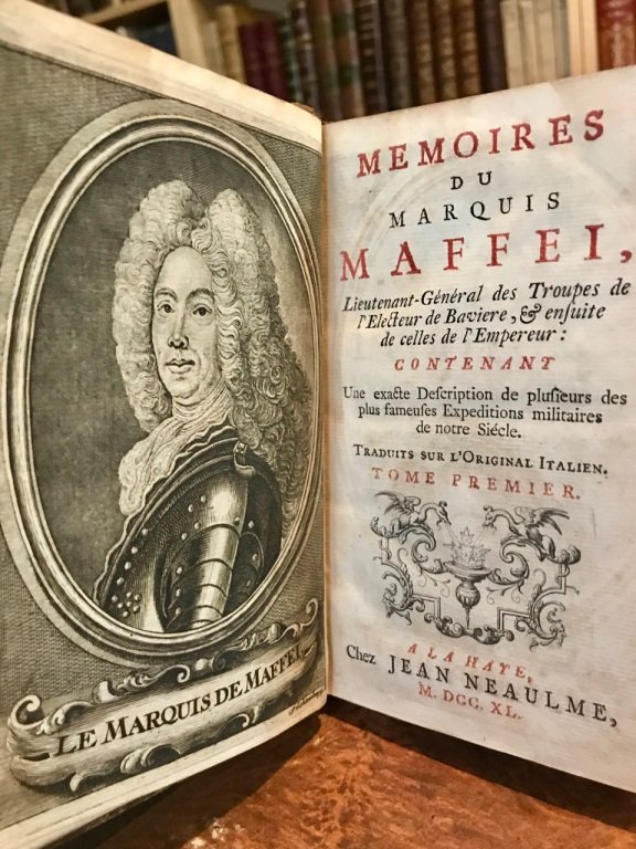 2 volumi in-8° (cm. 15,2), legature coeve in p. pelle con titolo e fregi in oro ai dorsi (un piccolo strappo alla cuffia del secondo tomo), piatti inquadrati in triplice cornice in oro (lievi abrasioni), tagli spruzzati e risguardi marmorizzati, due ritratti del condottiero in rame in antiporta n.t. (identici); pp. [4] CXXVI 196, [4] 304 [48] comprensive del catalogo librario del Neaulme; sporadiche macchie, poche fioriture e leggera brunitura uniforme. Edizione francese dell'autobiografia del generale veneto tradotta da Jean François Séguier. Maffei comandava le truppe dell'elettore di Baviera, la prima edizione era stata curata in italiano dal fratello Scipione (Verona 1737). Cfr. Barbier III, 219. Buon esemplare. (NH3)